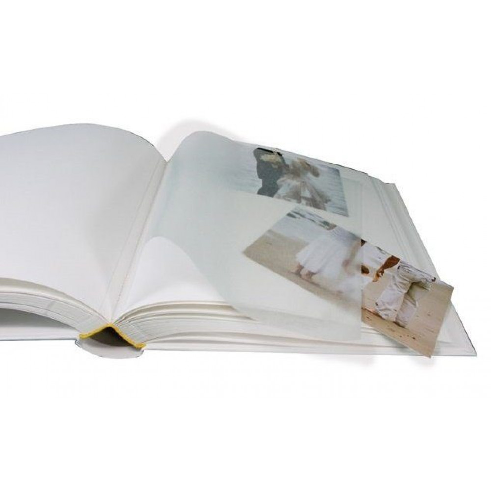 Альбом в книжном переплёте с обложкой из высококачественной фактурной бумаги и окошком на лицевой стороне для личного фото. Размер 30х30 см, в альбоме 100 страниц, белые пергаминовые межстраничные листы