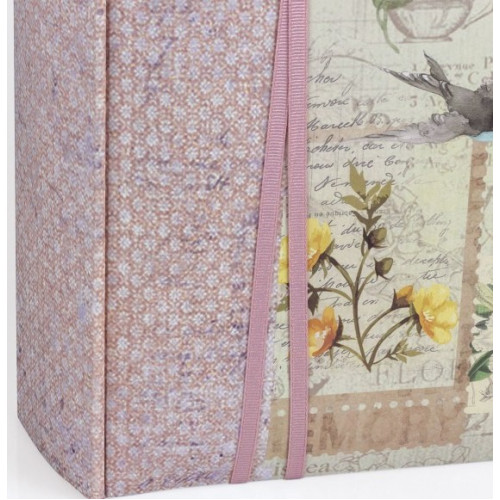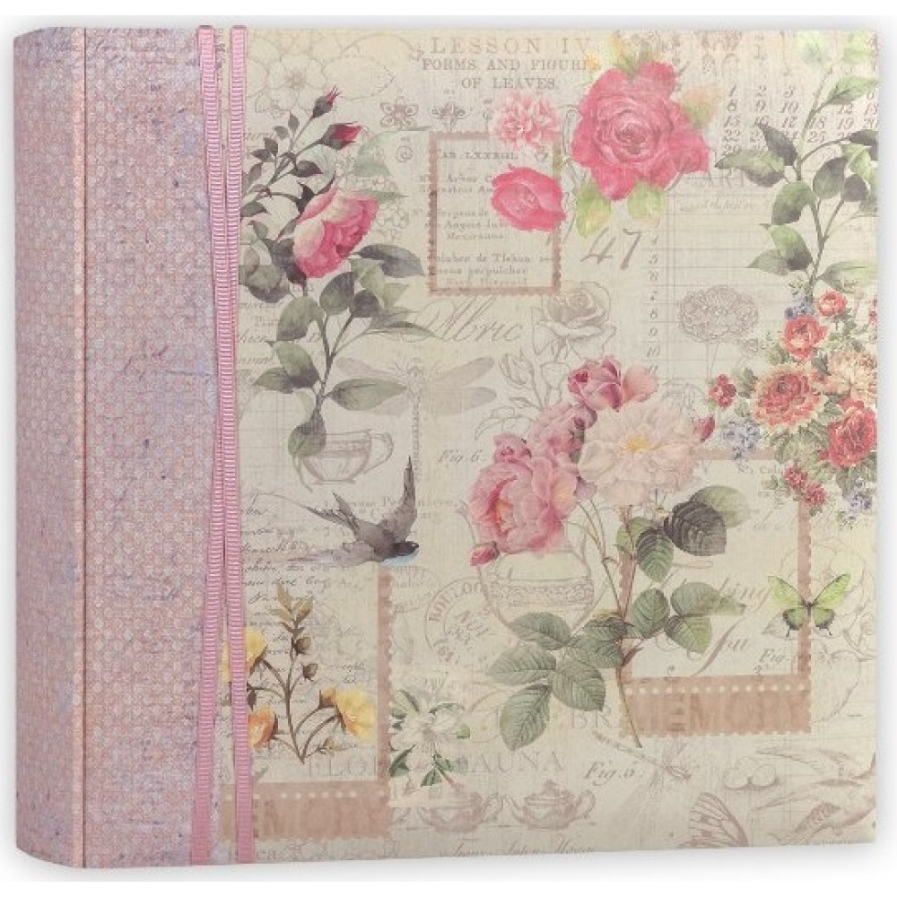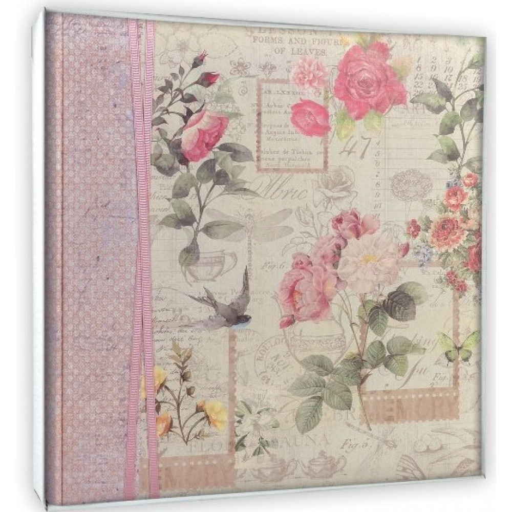 Фотоальбом в книжном переплёте с обложкой из бумаги с цветочным рисунком, с декоративной тканевой лентой.В альбоме 100 белых, не содержащих кислоты страниц, белые пергаминовые межстраничные листы.