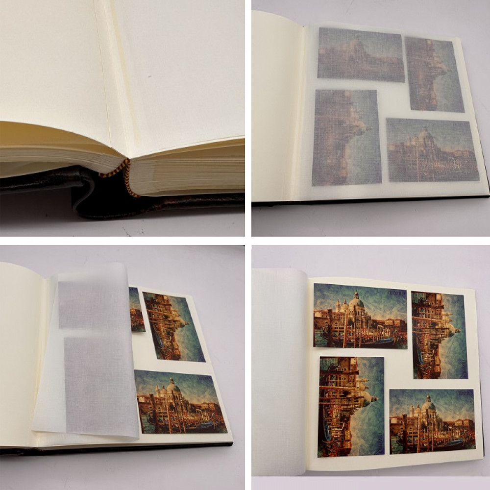 Фотоальбом Tezoro модель " Лев Марон" имеет классический блок - плотный дизайнерский картон цвета слоновой кости, каждая страница проложена пергаментом.На страницах можно не только делать надписи, но и размещать фотографии.