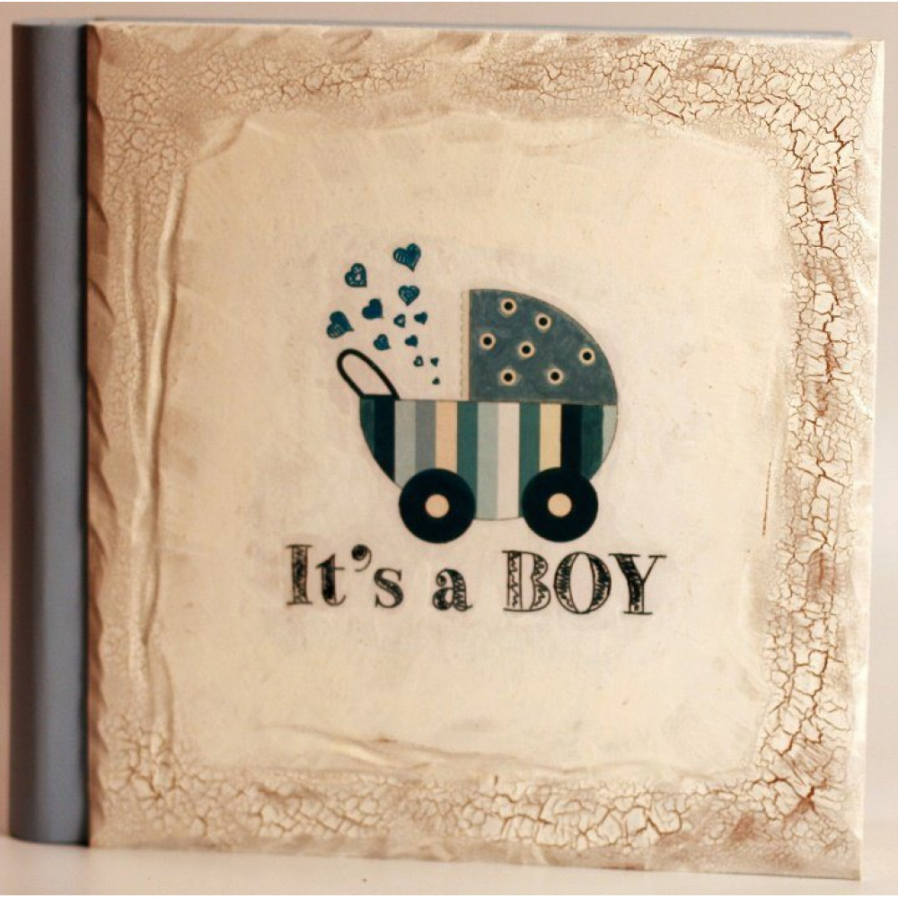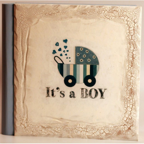 Снаружи приятная цветовая гамма и изображение коляски с надписью "It's a boy".