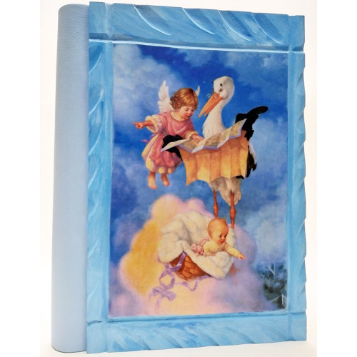 На рисунке изображен аист с ангелом, преобладает синий цвет. Фотоальбом для новорожденного мальчика .