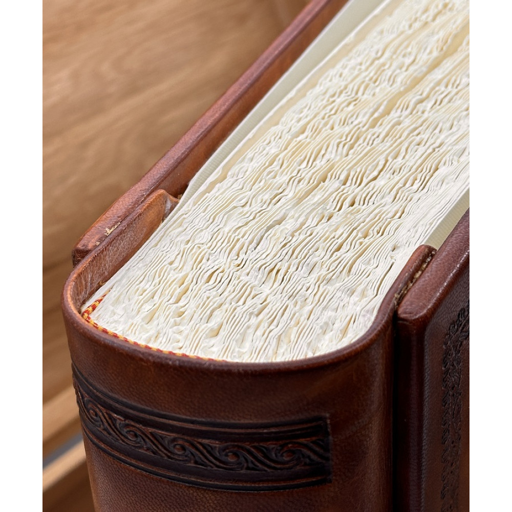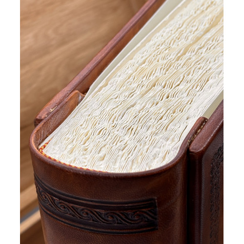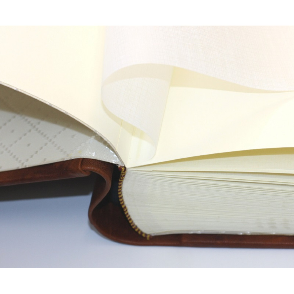 Фотоальбом Tezoro модель "Торно" имеет классический блок - плотный дизайнерский картон цвета слоновой кости, каждая страница проложена пергаментом.
