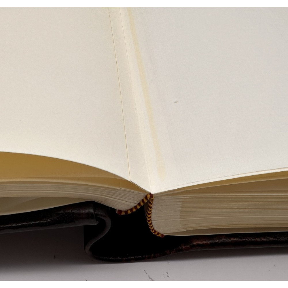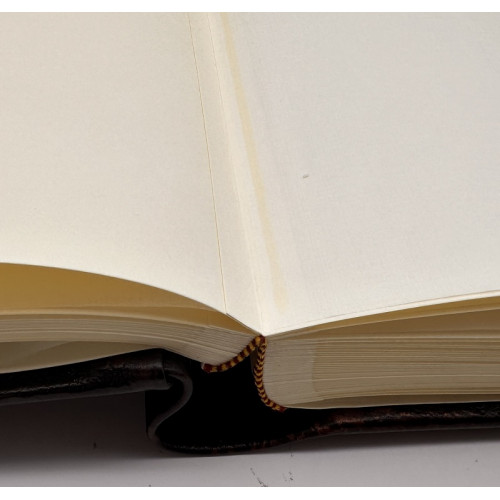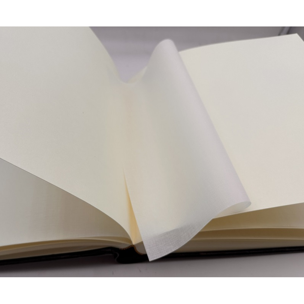 Внутри альбома классический блок, состоящий из дизайнерского картона, проложенного пергаментом и книжного переплета.