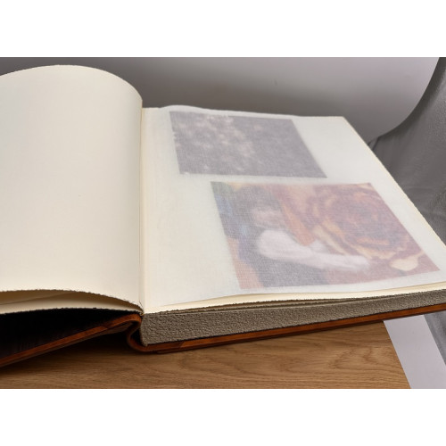 Внутри - наш фирменный классический блок, состоящий из дизайнерского картона, проложенного пергаментом и книжного переплета.