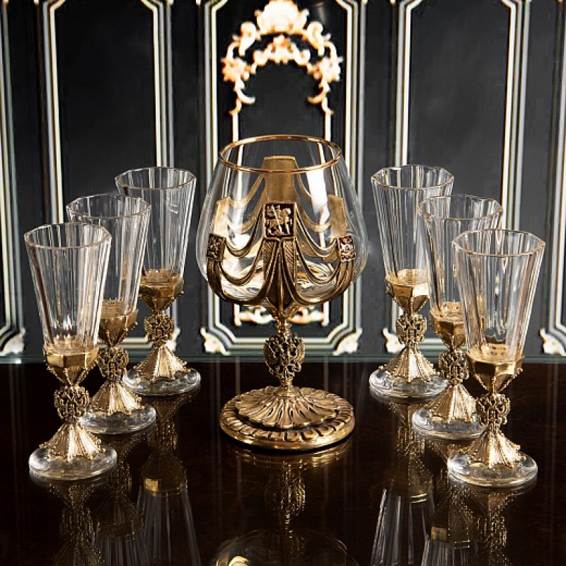 | Материал изделия | Бокал, лафитники: патинированная латунь/стекло, упаковка: массив дерева |