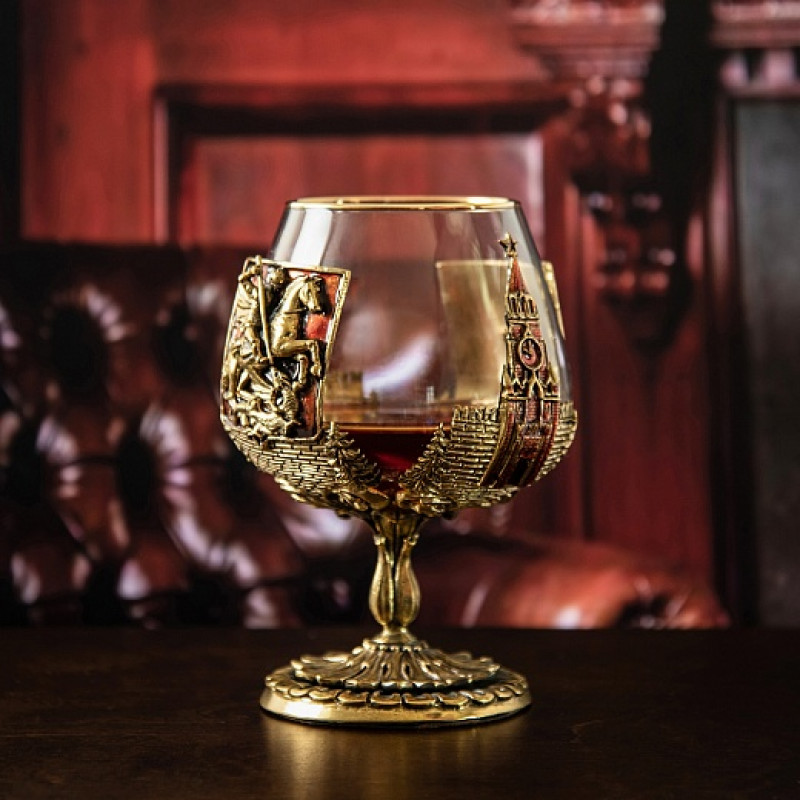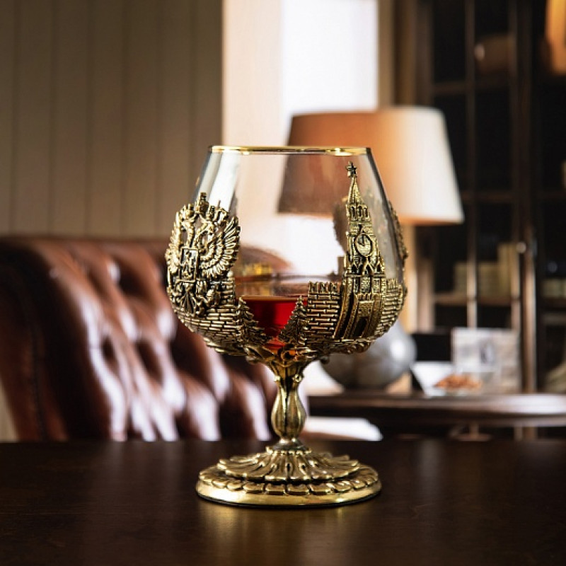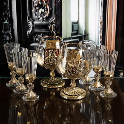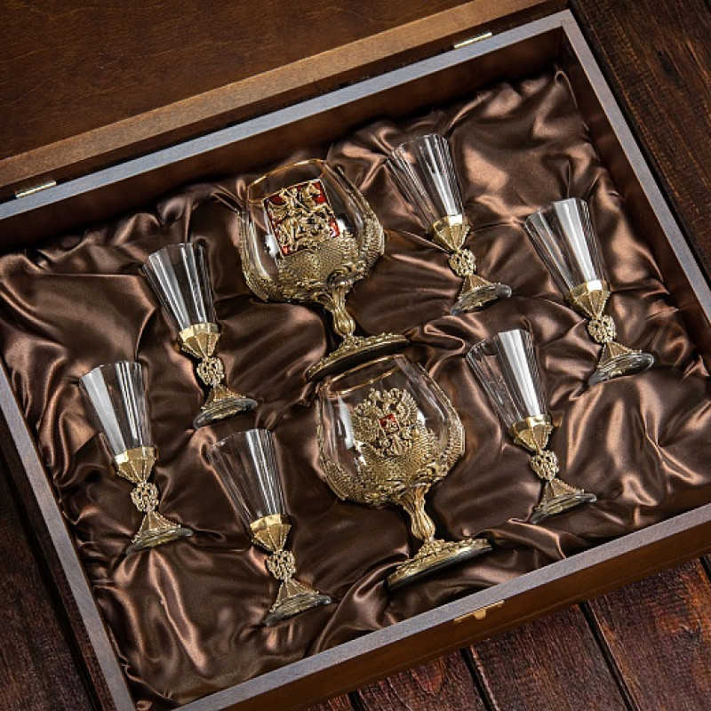 В наборе 2 бокала для коньяка (Россия, Москва), 6 лафитников с гербом (стопка купеческая), деревянная шкатулка, ложемент коричневый шелк