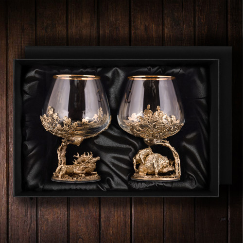 Набор включает 2 бокала для коньяка с латунным основанием "Охота на Оленя" и "Охота на Вепря" в черной коробке из дизайнерского картона.