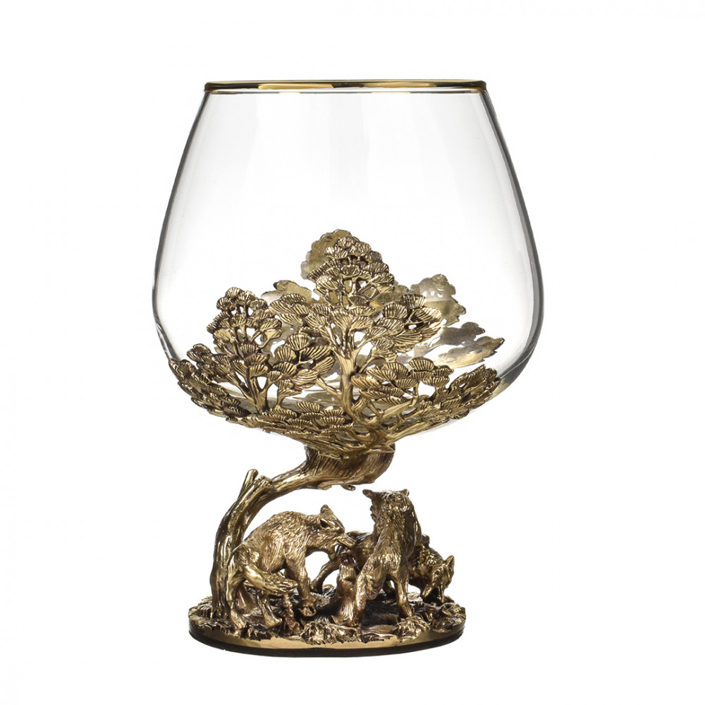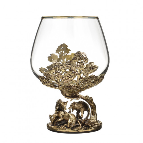 Набор включает 2 бокала для коньяка с латунным основанием "Волки" и "Медведи" в черной коробке из дизайнерского картона.