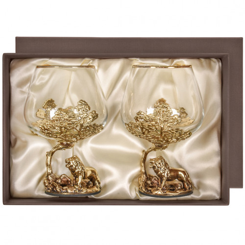 Набор из 2 бокалов для коньяка "Лев", в черной коробке из дизайнерского картона. В набор входит: 2 бокала для конька с латунным основанием в виде Льва и упаковка черная коробка из дизайнерского картона. Каждый бокал украшен латунным основанием.