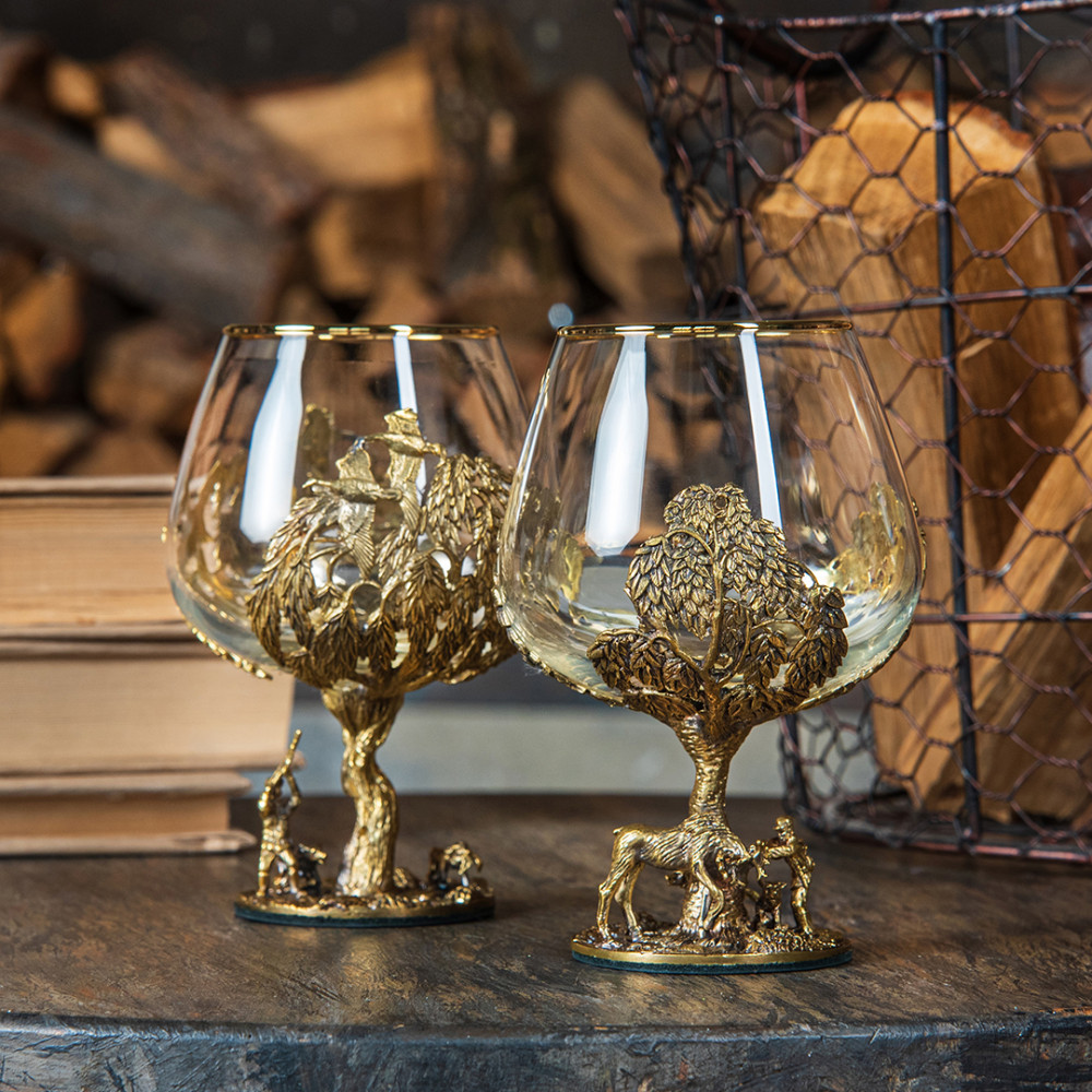 Набор включает 2 бокала для коньяка с латунным основанием "Охота на Уток" и "Охота на Лося" в черной коробке из дизайнерского картона.