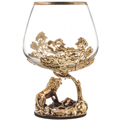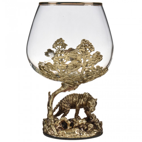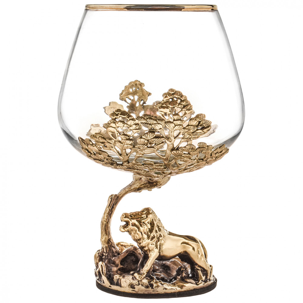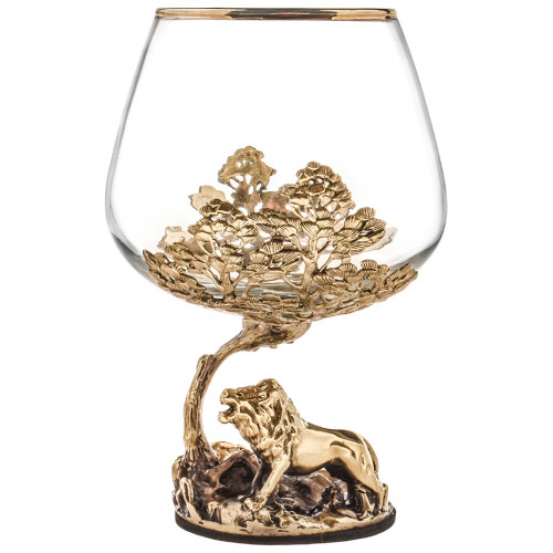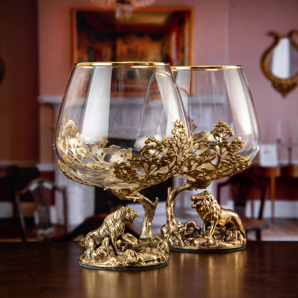 Набор включает 2 бокала для коньяка с латунным основанием "Тигр" и "Лев" в черной коробке из дизайнерского картона.