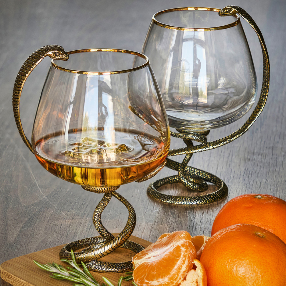Набор включает бокалы для коньяка и уникальную статуэтку змея. Это статусный подарок, который подчеркнет изысканный вкус получателя. Все элементы набора сделаны в ручную с ювелирной точностью, что придает им особую ценность. Каждый бокал идеально подходит для наслаждения коньяком, раскрывая его аромат и вкус.