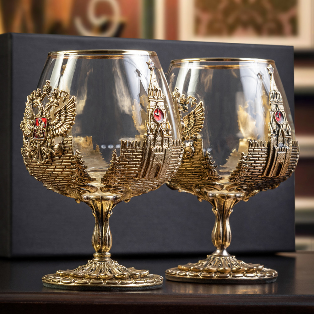 Набор включает 2 бокала для коньяка с латунным основанием "Россия" в черной коробке из дизайнерского картона.