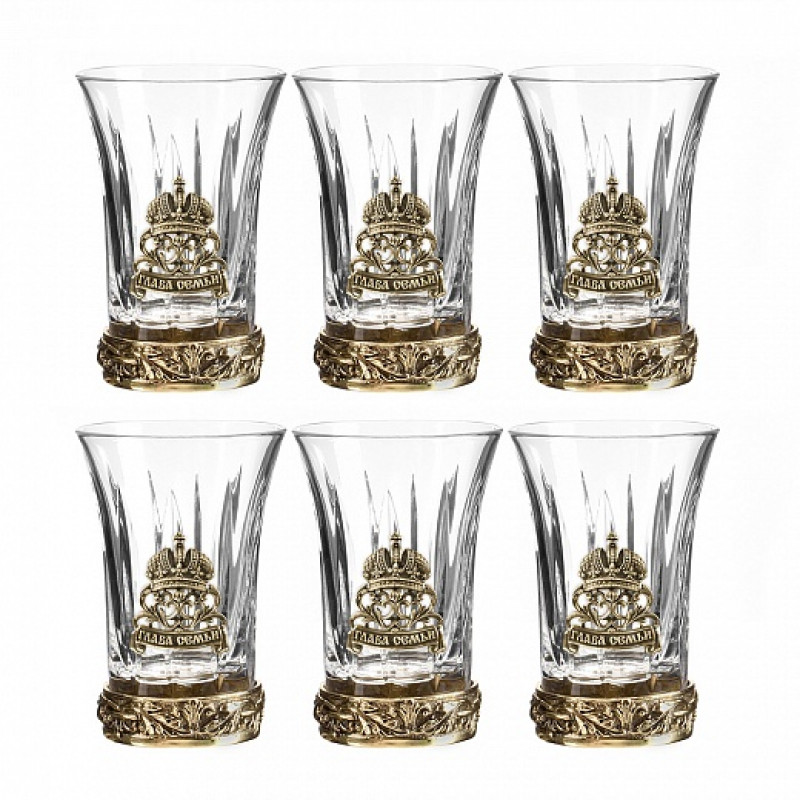 | Комплектация | Штоф с накладкой Глава семьи; 6 стопок для водки с латунным основанием и накладками Глава семьи; Деревянная шкатулка |