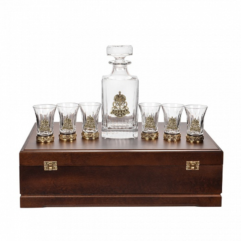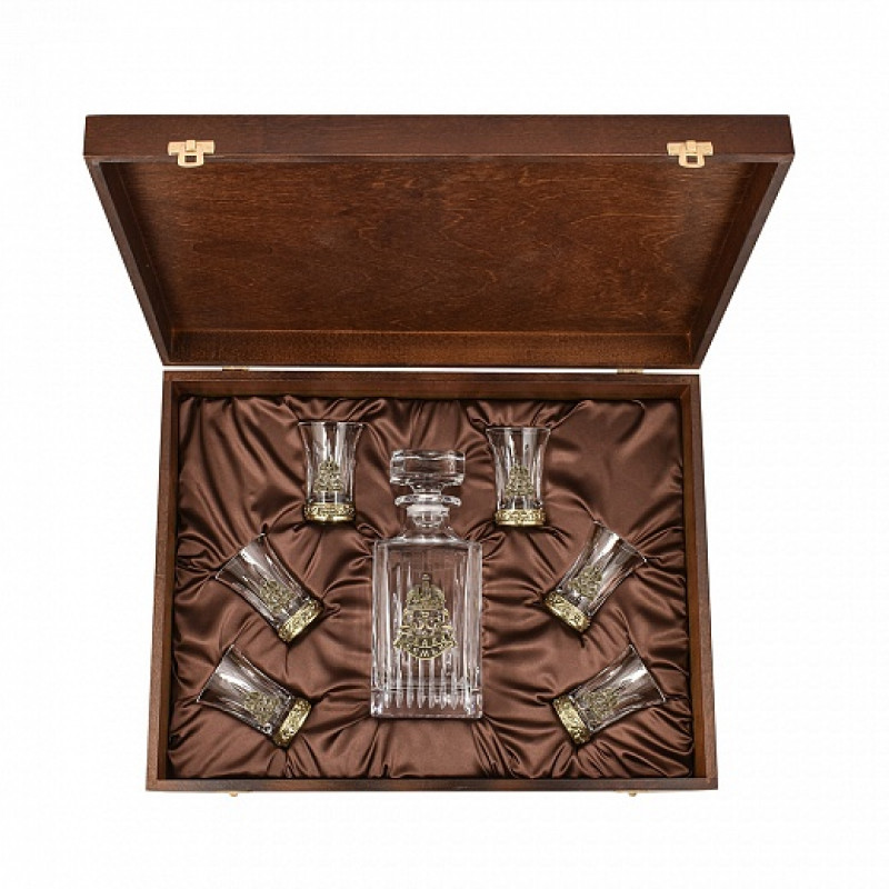 | Материал изделия | Стопка: патинированная латунь/стекло, штоф: стекло: упаковка: массив дерева |