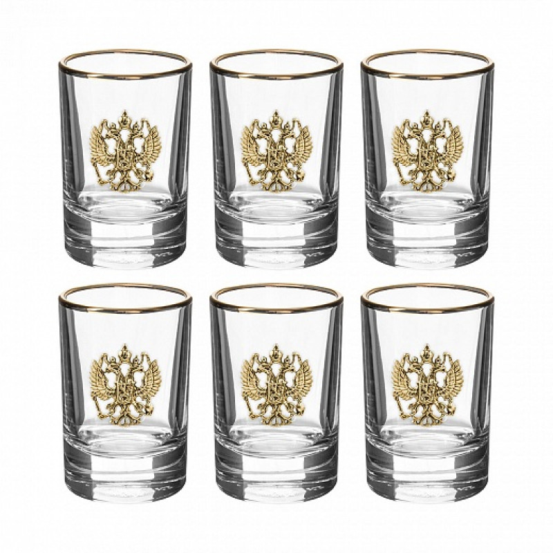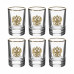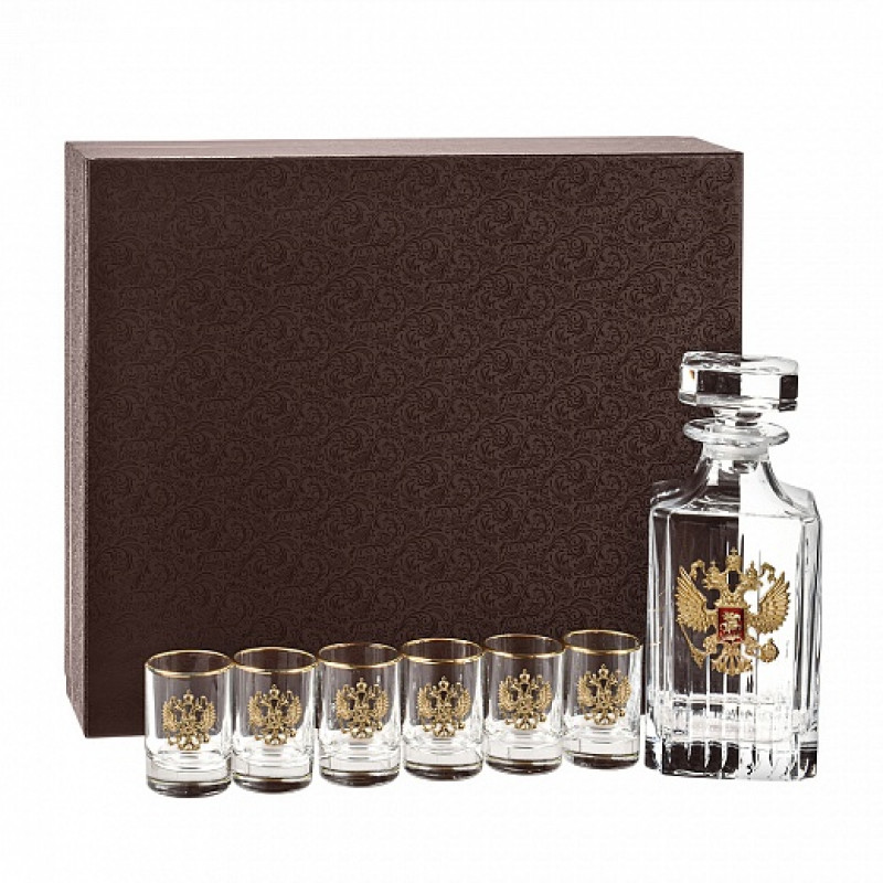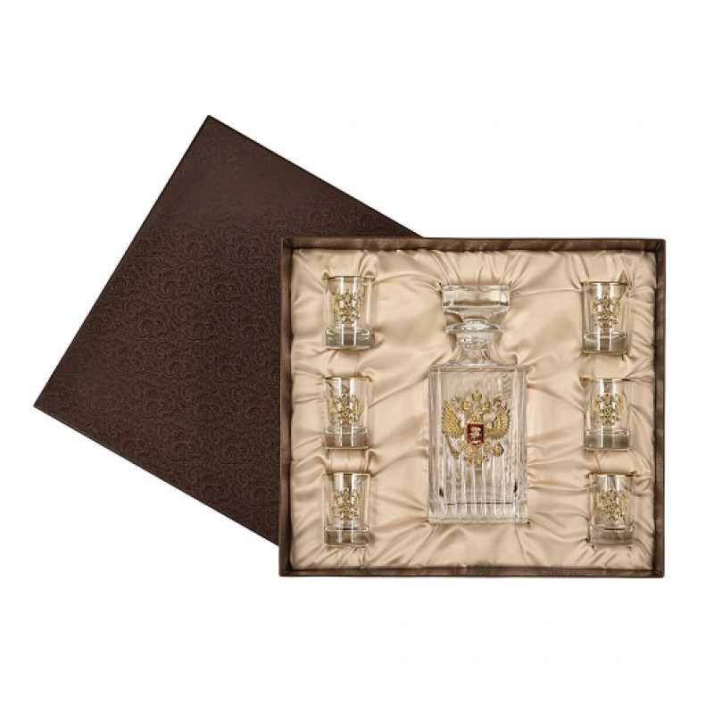 В составе набора штоф подарочный с латунной накладкой Герб России, и шесть стопок с золотой обводкой и накладкой герб России