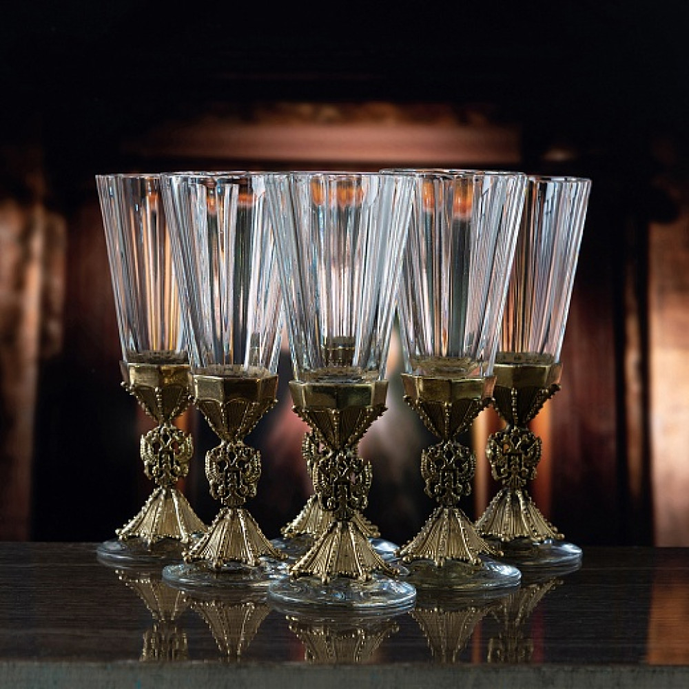 | Комплектациястопки для водки(лафитники) | Материал изделияСтопка из стекла, ножка латунь | Объем60 мл |