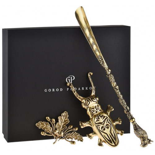 | Цветбронза | Ширина предметаЛожка 4 см, Жук 11 см, Держатель 10 см | Ширина упаковки39 см |