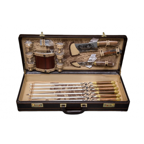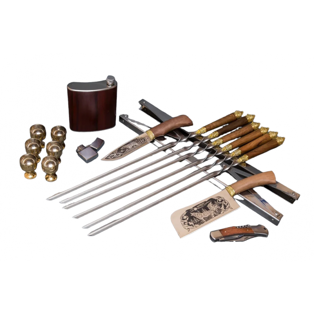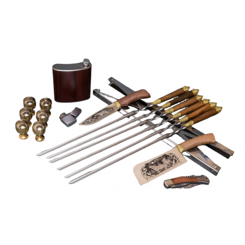 | Комплектация: | нож складной - 1 шт, зажигалка - 1 шт, шампура - 6 шт, мангал - 1 шт, нож разделочный - 1 шт, рюмки - 6 шт, фляжка 0,5 мл - 1 шт, топорик разделочный - 1 шт, водонепроницаемый чехол |